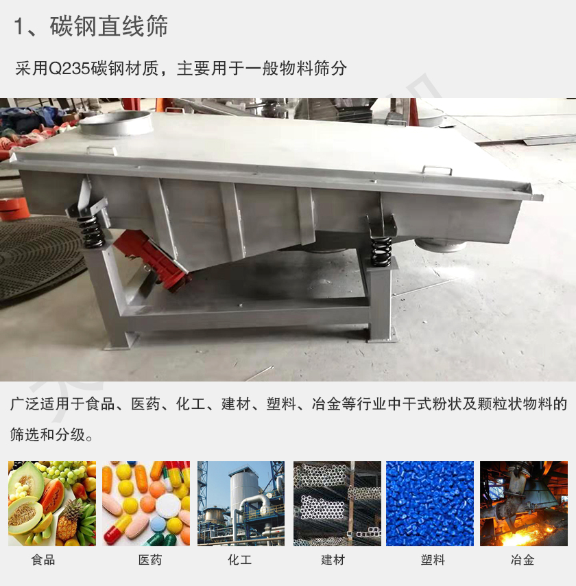 碳鋼直線篩主要采用Q235碳鋼材質,主要用于一般物料篩分,廣泛适用于食品、醫藥、化工、建材、塑料、冶金等行業中幹式粉狀及顆粒狀物料的篩選和分級。