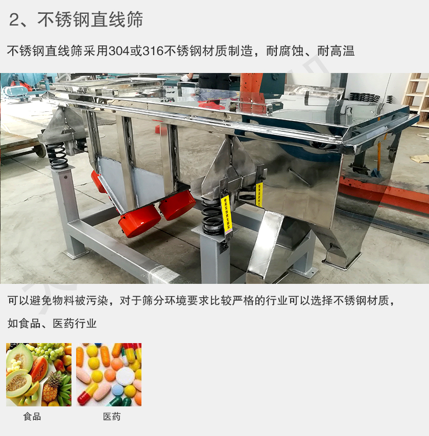 不鏽鋼直線篩采用304或316不鏽鋼材質制造,耐腐蝕、耐高溫,并且不易生鏽,可以避免物料被污染,對于篩分環境要求比較嚴格的行業可以選擇不鏽鋼材質,如食品、醫藥行業。