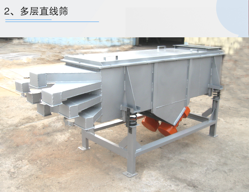 多層直線篩采用多層全封閉結構設計,多個出料口,可把篩分物料按大小粒度分爲多個等級,大漢多層直線篩篩面層數可達5層,可對同時對2~6個不同等級的物料進行分級。